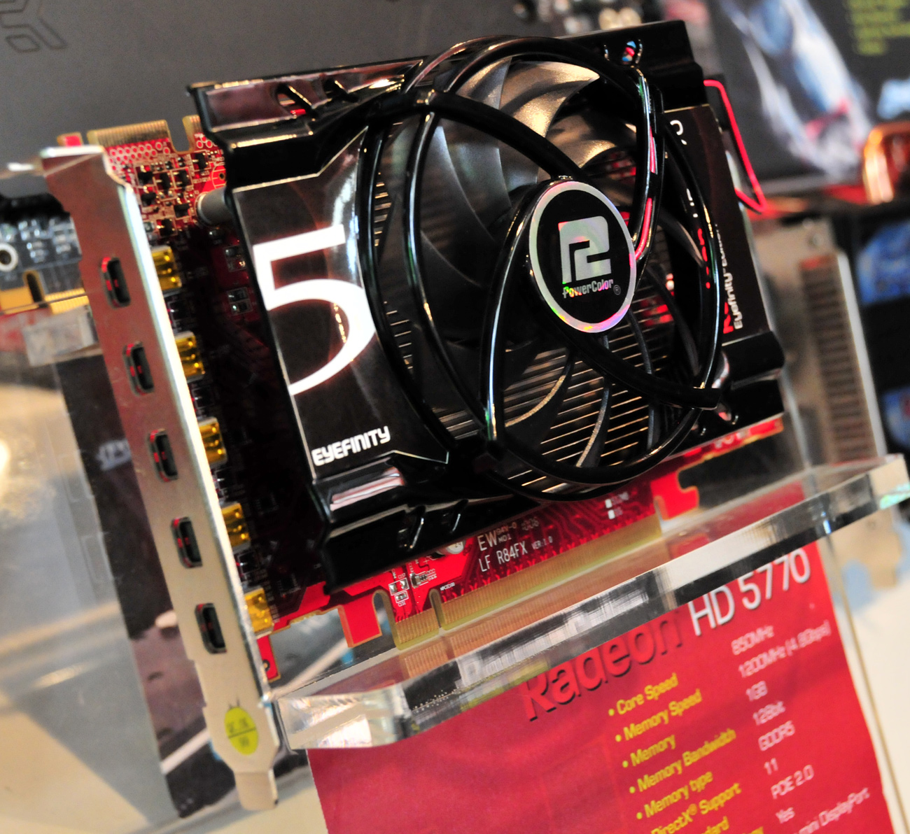 Et maintenant encore mieux la Powercolor Radeon 5770, fournie avec 1 Go cadencé à 1,2 Ghz (c’est un peu plus que la Radeon HD 5750 Fanless) et le GPU a une fréquence de 850 Mhz, mais quand je dis que cette carte graphique est encore mieux c’est qu’elle est un peu spécial, cela se situe du côté de la connectique qui content 5 connecteurs DisplayPort, imaginez ceci